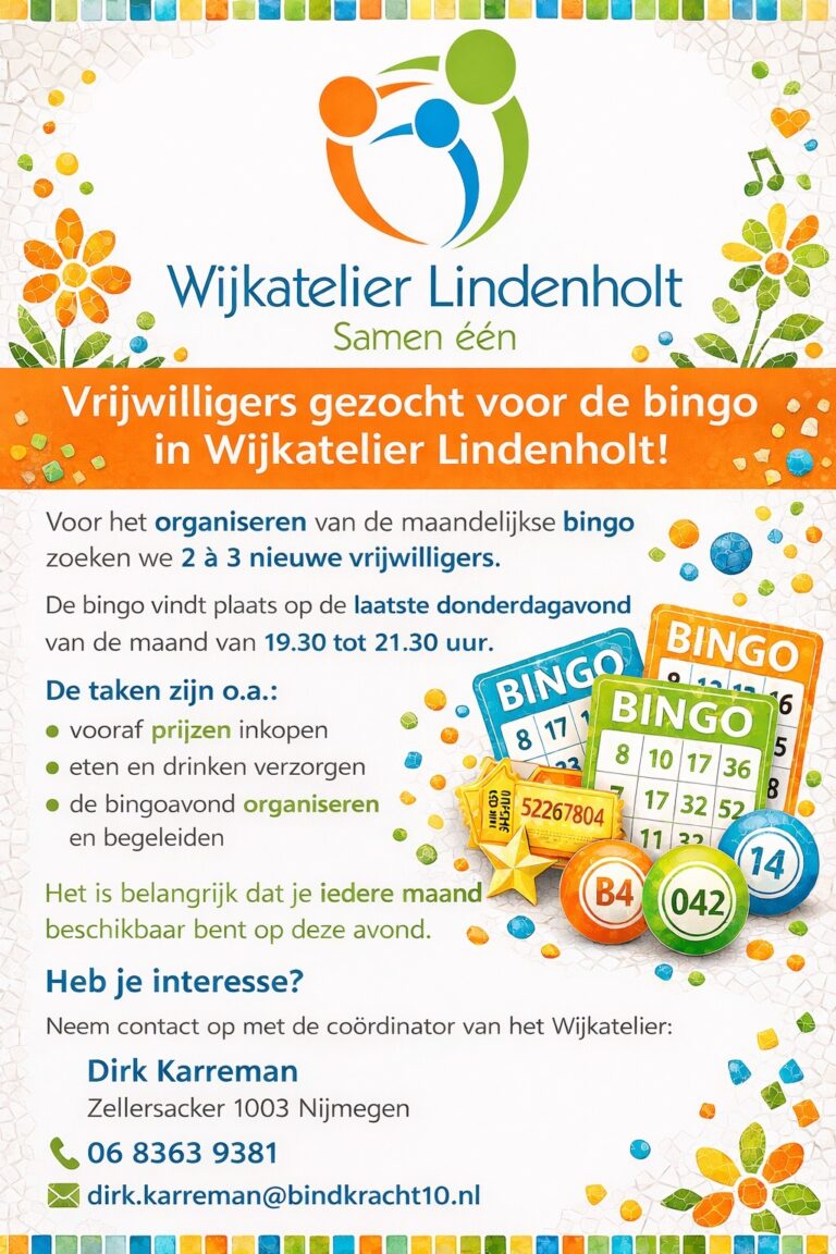 Vind je het leuk om samen met iemand anders de maandelijkse Bingo in het Wijkatelier Lindenholt te gaan organiseren? Geef je dan nu op!