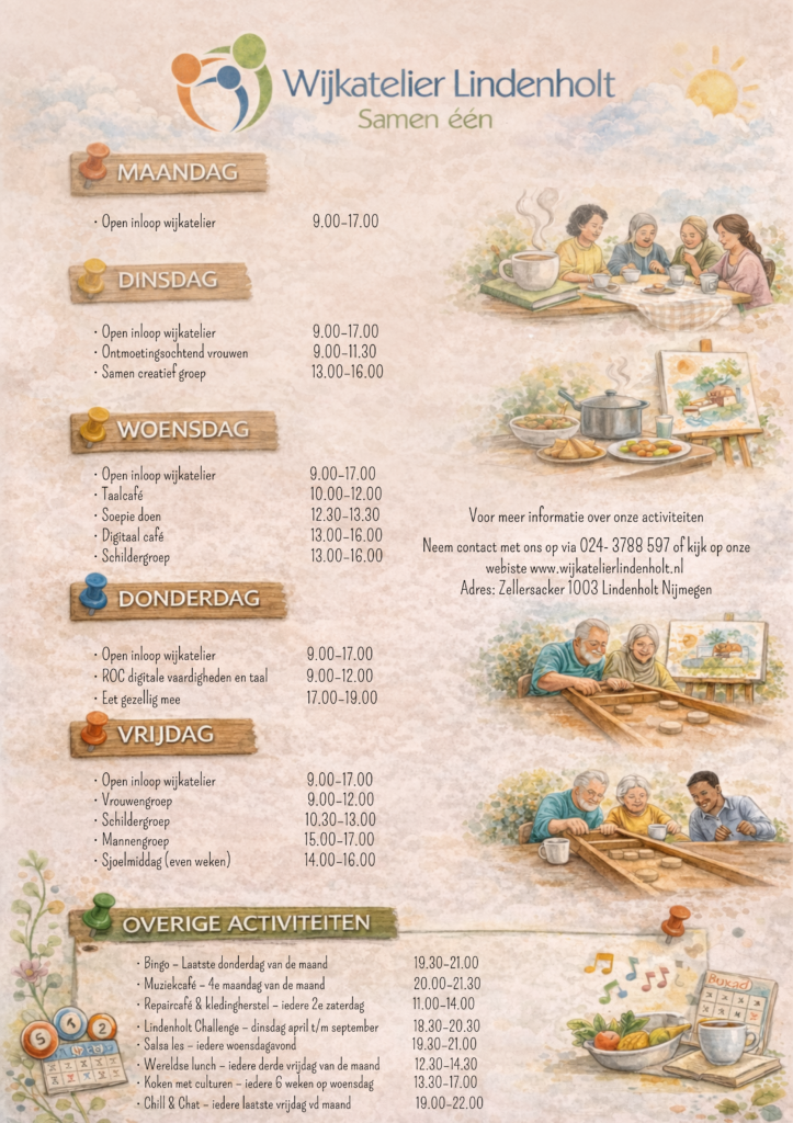 Ben jij op zoek naar een leuke activiteit, waarbij je medebewoners kunt ontmoeten? Zie het uitgebreide programma van het Wijkatelier Lindenholt. Je vindt ons aan de Zellersacker 1003.