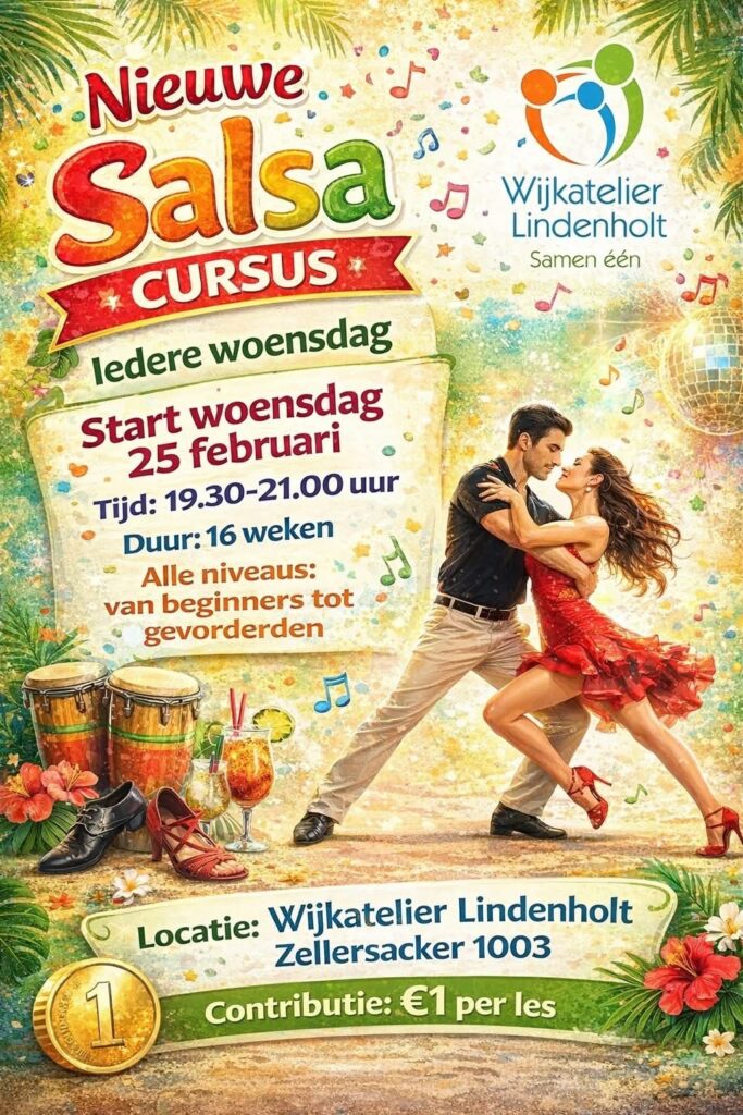 Salsa-cursus op alle niveaus: van beginners tot gevorderden. Start vanaf woensdag 25 februari wekelijks van 19.30 tot 21.00 uur in het wijkatelier Lindenholt. Contributie: 1 euro per les.